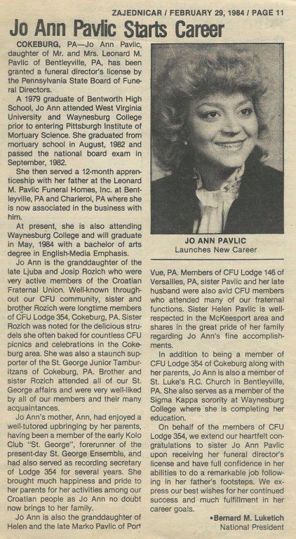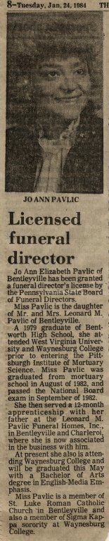 1982- JoAnn Pavlic (daughter of Leonard) graduates from the Pittsburgh Institute of Mortuary Science. Begins her internship under her father.